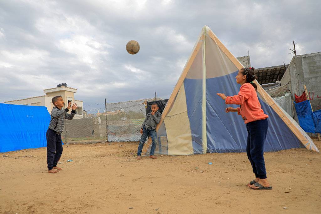 2月18日,巴勒斯坦儿童在加沙地带南部城市拉法的临时营地内玩耍。