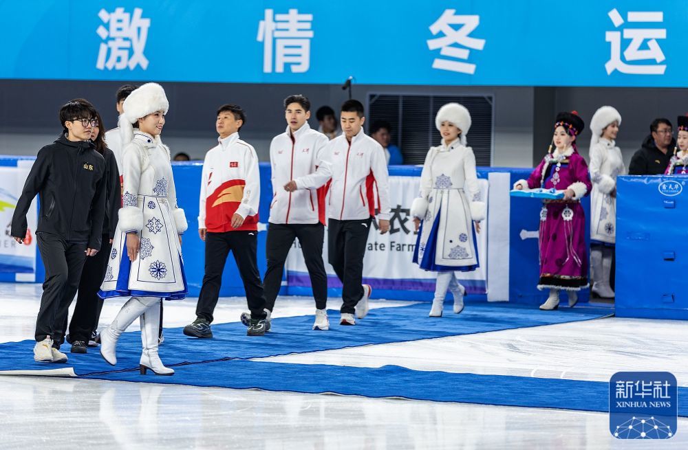 ↑2月18日,志愿者(前)在短道速滑馆内举行的颁奖仪式上引导运动员入场。新华社记者 黄伟 摄