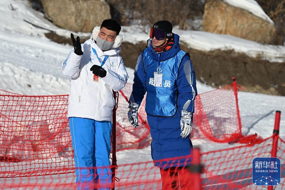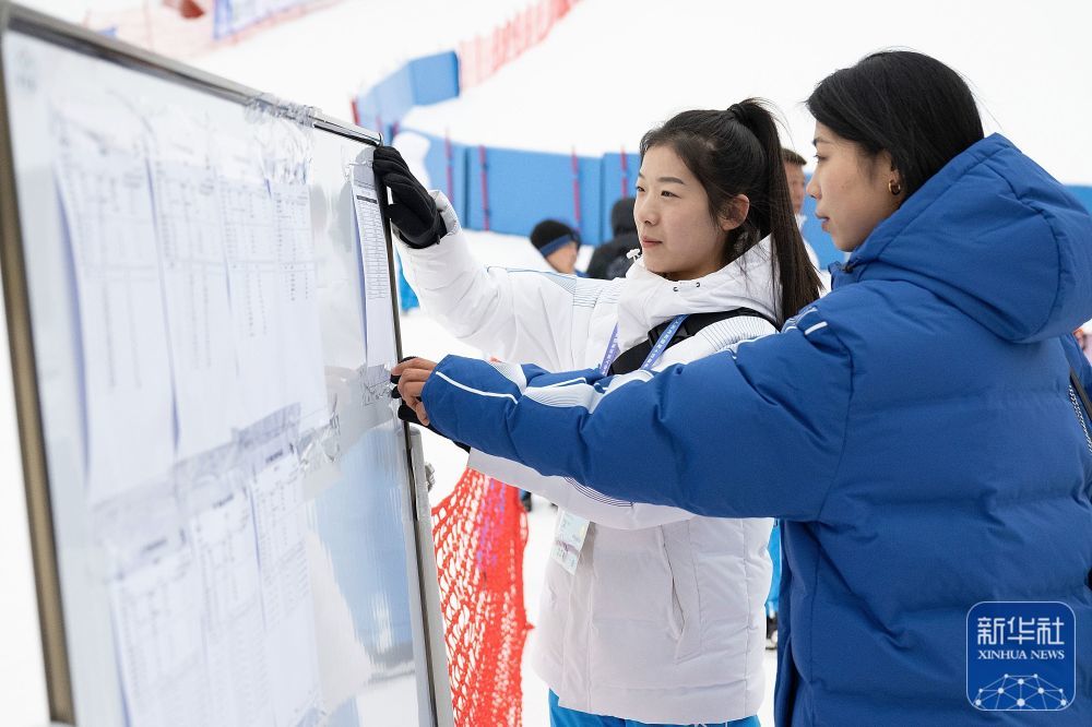 ↑2月19日,在凉城赛区,一位志愿者(左)与裁判员交流赛场情况。新华社记者 李志鹏 摄