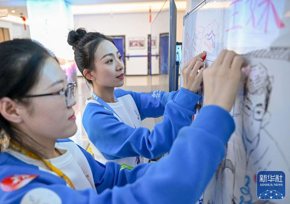 ↑2月19日,来自中国传媒大学的志愿者王琳(右)和同伴在主媒体中心张贴班车时刻表。她是由北京团市委选派支援“十四冬”的30名北京冬奥会志愿者之一。新华社记者 连振 摄