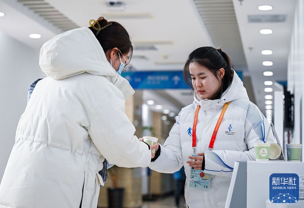 ↑2月18日,来自呼伦贝尔职业技术学院的志愿者张娜(右)为观看短道速滑比赛的观众递上热水。新华社记者 连振 摄