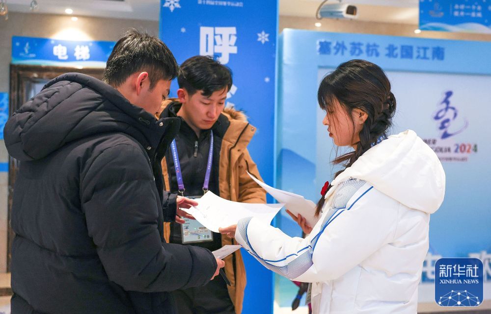 ↑2月18日,来自呼伦贝尔职业技术学院的志愿者阿娜尔(右一)向媒体记者提供赛程表。新华社记者 连振 摄