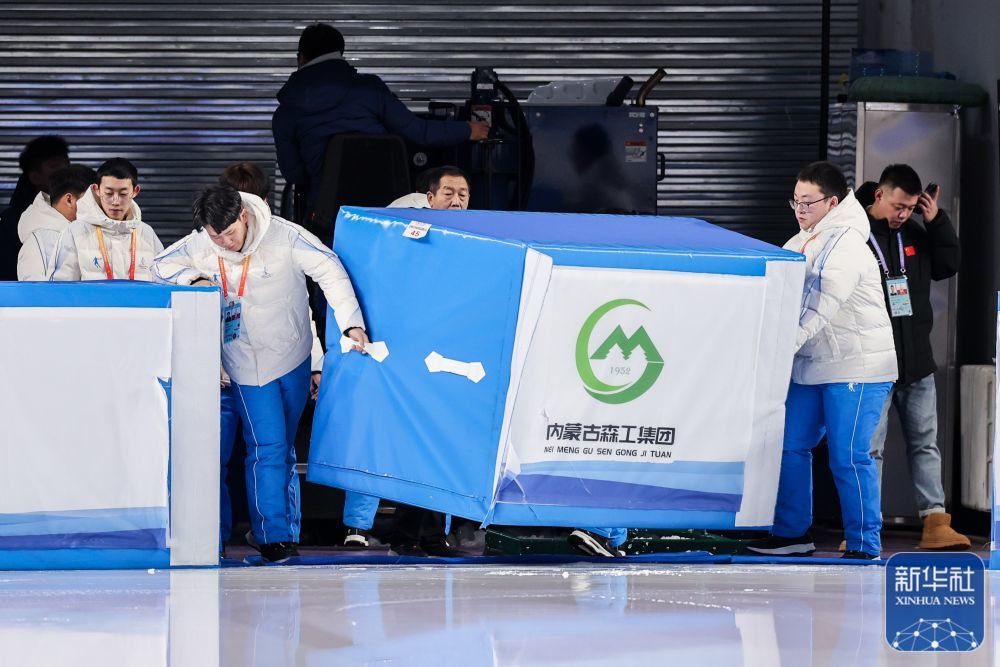 ↑2月18日,在内蒙古冰上运动训练中心短道速滑馆,志愿者们在赛前搬运赛场边的防撞垫。新华社记者 李博 摄