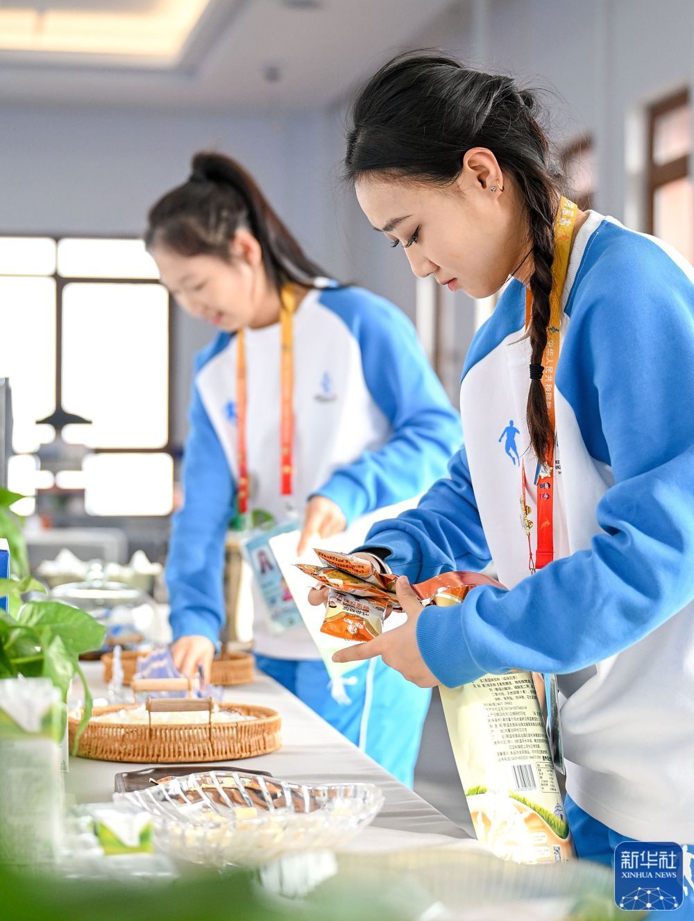 ↑2月19日,来自呼伦贝尔职业学院的志愿者刘瑞旸在媒体中心休息区整理茶点。新华社记者 连振 摄