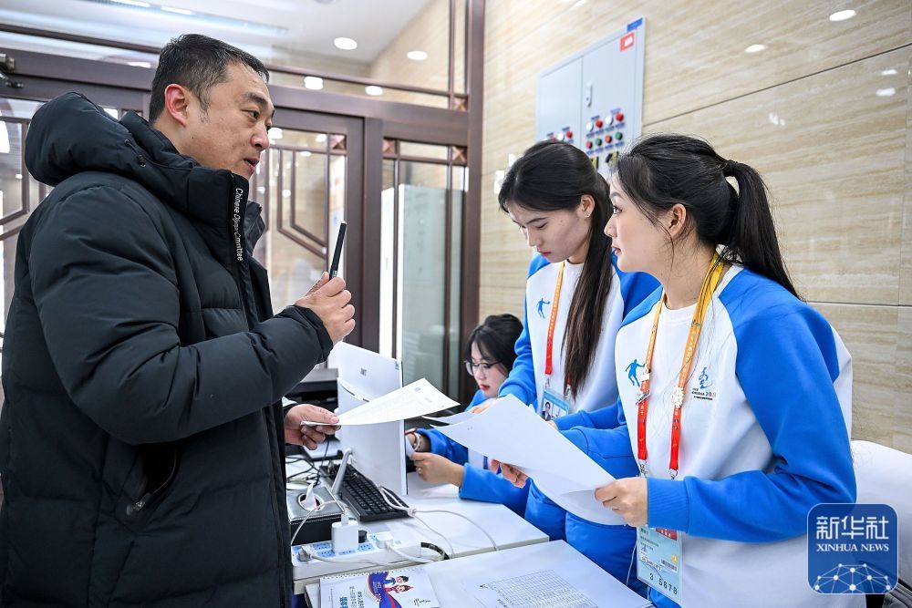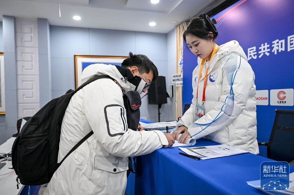 ↑2月18日,来自呼伦贝尔职业技术学院的志愿者陈艳丽(右)登记媒体记者信息。新华社记者 连振 摄