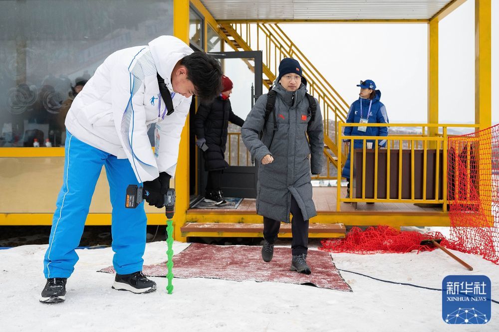 ↑2月18日,在扎兰屯赛区,竞赛服务志愿者(左一)在裁判房前的雪地上钻孔防滑。新华社记者 谢剑飞 摄