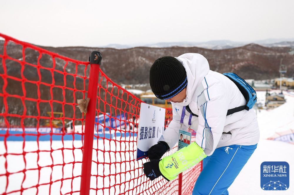 ↑2月18日,在扎兰屯赛区,志愿者在自由式滑雪雪上技巧比赛场地固定摄影位置标牌。新华社记者 王楷焱 摄
