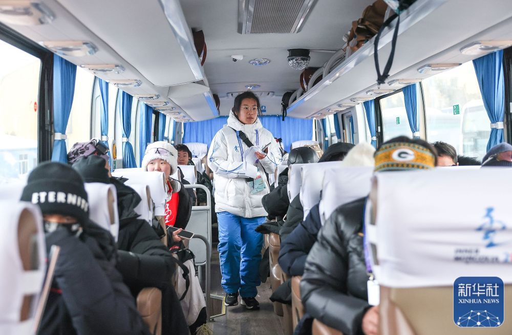 ↑2月18日,在扎兰屯赛区,志愿者在比赛结束后上车清点返回酒店的人员人数。新华社记者 王楷焱 摄