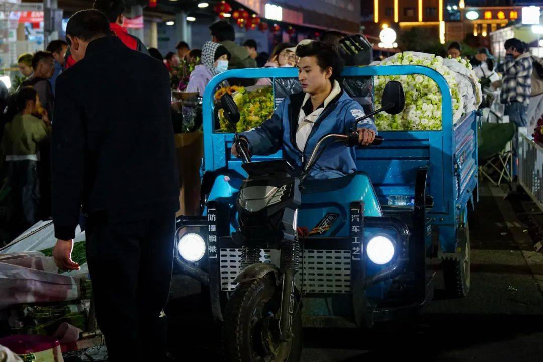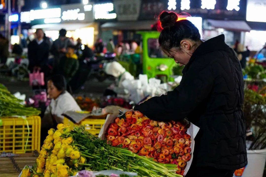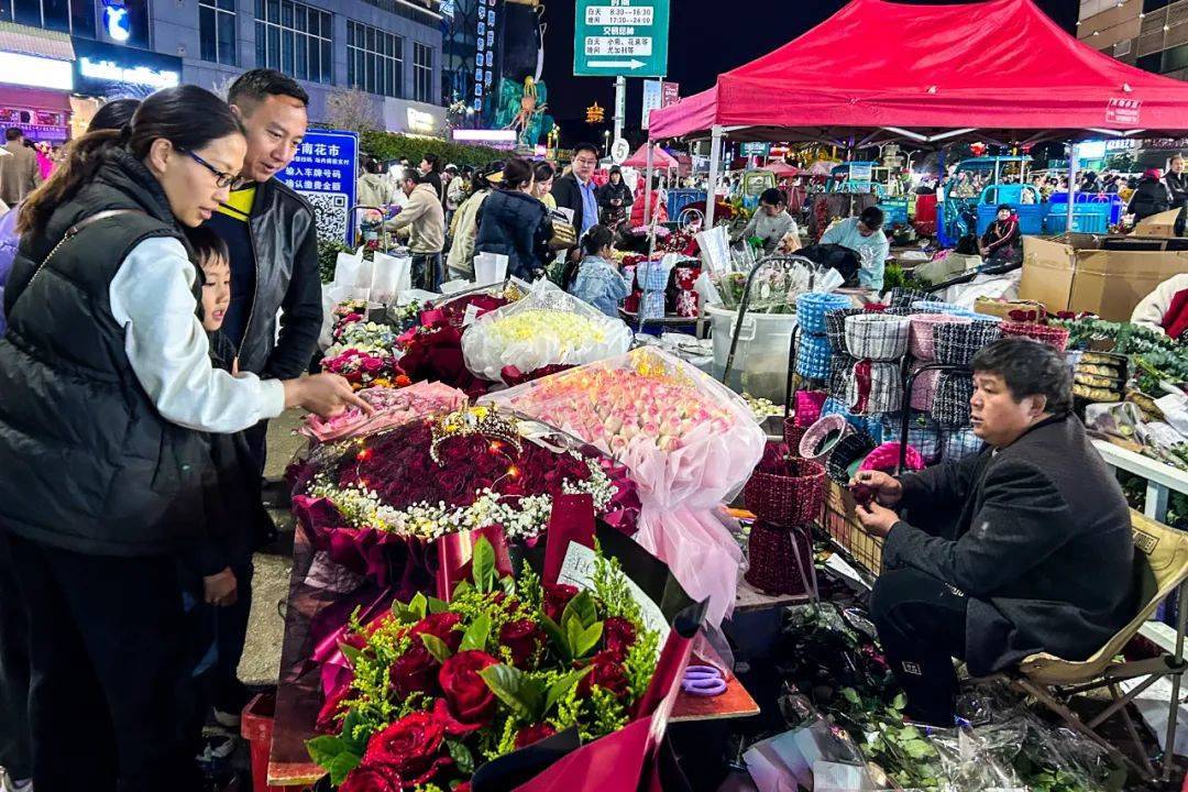 晚上九点,来自五湖四海的消费者源源不断地涌入斗南花市,有来挑选情人节礼物的,有来打卡拍照的,更多的是将一束束“浪漫”打包回家。