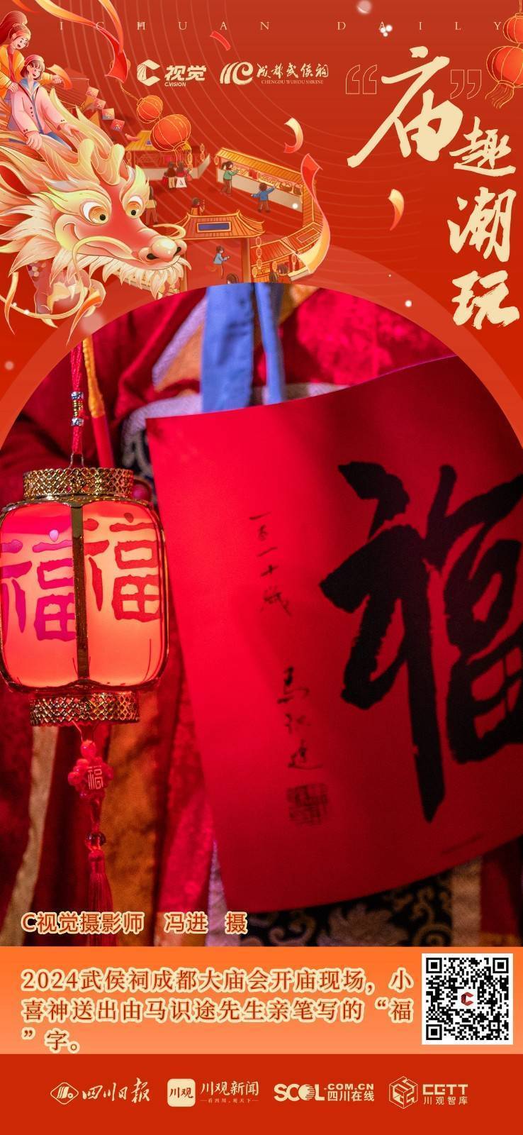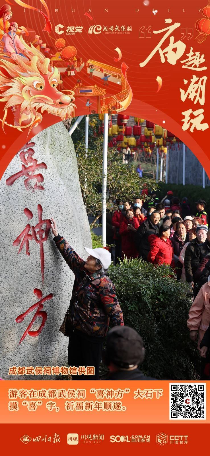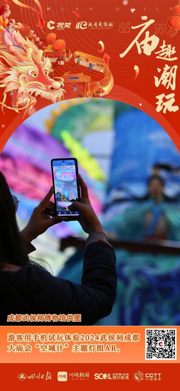 以“空城计”、“卧龙腾飞”、“蜀汉盛景”等15组主题灯组和14组氛围灯组,结合AR、VR技术精心打造的“过去、现在、未来”的“三国元宇宙”让游客们惊喜连连。成都武侯祠甲辰龙年“游喜神方”活动中,“小喜神”们巡游送福,与市民观众积极互动,派发喜神红包、福牌、福贴等新年小礼物,表演诵国学、唱童谣等新春祝福节目,市民与游客纷纷在三义庙前祈福,摸“喜神方”石,讨好彩头。特别展出的“义薄云天——关公主题精品文物展”颇受观众青睐,人气居高不下。传统与潮流、文化与时尚相互交融,在“2024武侯祠成都大庙会”,地道成都年味拉满了!