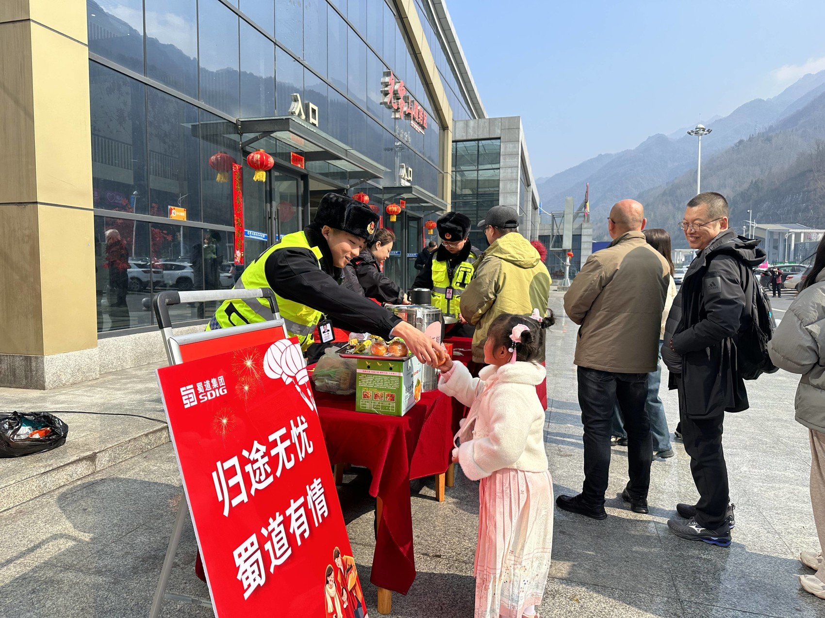 2月10日,省交通执法总队第七支队十二大队在G85银昆高速公路巴陕段光雾山服务区开展“情满旅途”春运志愿服务活动。四川省交通运输厅供图