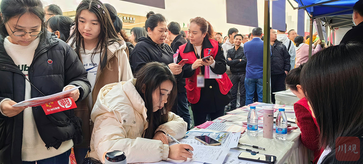 招聘会现场,人头攒动,多家企业的招聘摊位前排起了长龙。“刚来不久,已经有10多个求职者填了基本信息,应聘人员的条件都还不错。”四川恒力智能纺织科技有限公司招聘专员谢旭介绍,公司现有用工近3000人,考虑到日常的人员流动,这次公司带来200多个岗位,招聘操作工200人左右,业务员20人。