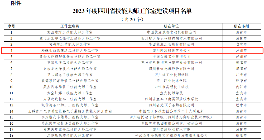 近日,四川省人力资源和社会保障厅等五部门联合发文,认定20个单位为2023年度四川省技能大师工作室建设单位,四川郎酒股份有限公司(以下简称“郎酒”)“邓皖玉白酒酿造工技能大师工作室”在列。据悉,该工作室为全省唯一入围的酒类企业相关单位。
