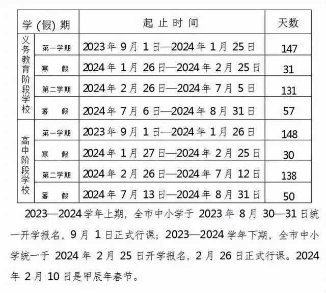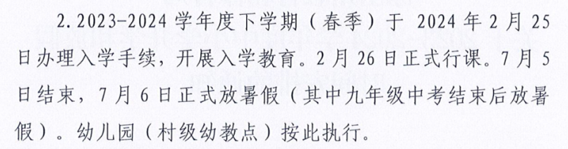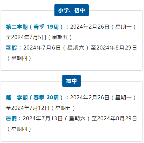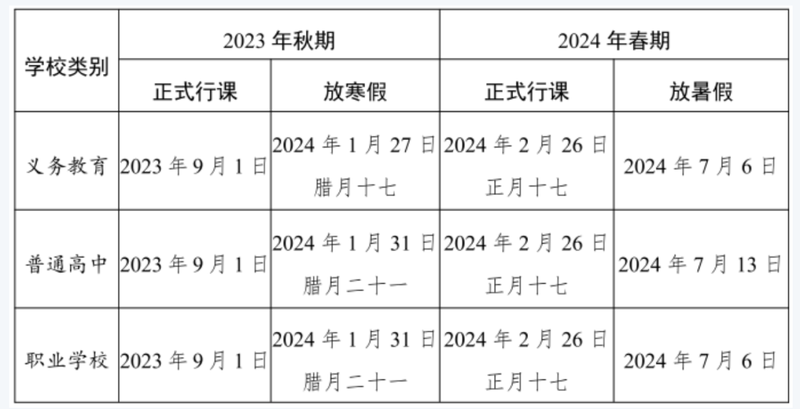 义务教育阶段,2月26日正式行课、7月5日结束,7月6日开始放暑假;高中阶段学校,2月26日正式行课、7月12日结束,7月13日开始放暑假。