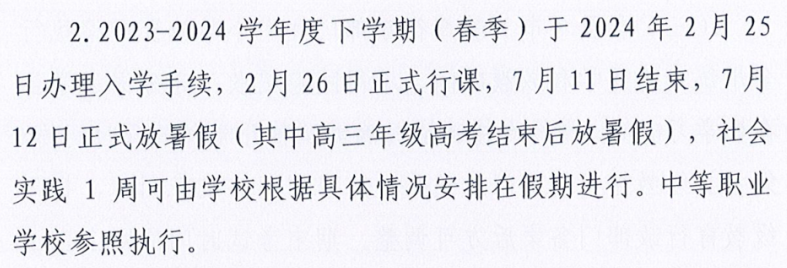 普通高中阶段于2月25日开学,2月26日正式行课,7月7日放暑假,教学时间19周。社会实践1周由学校自行安排。中等职业学校参照执行。