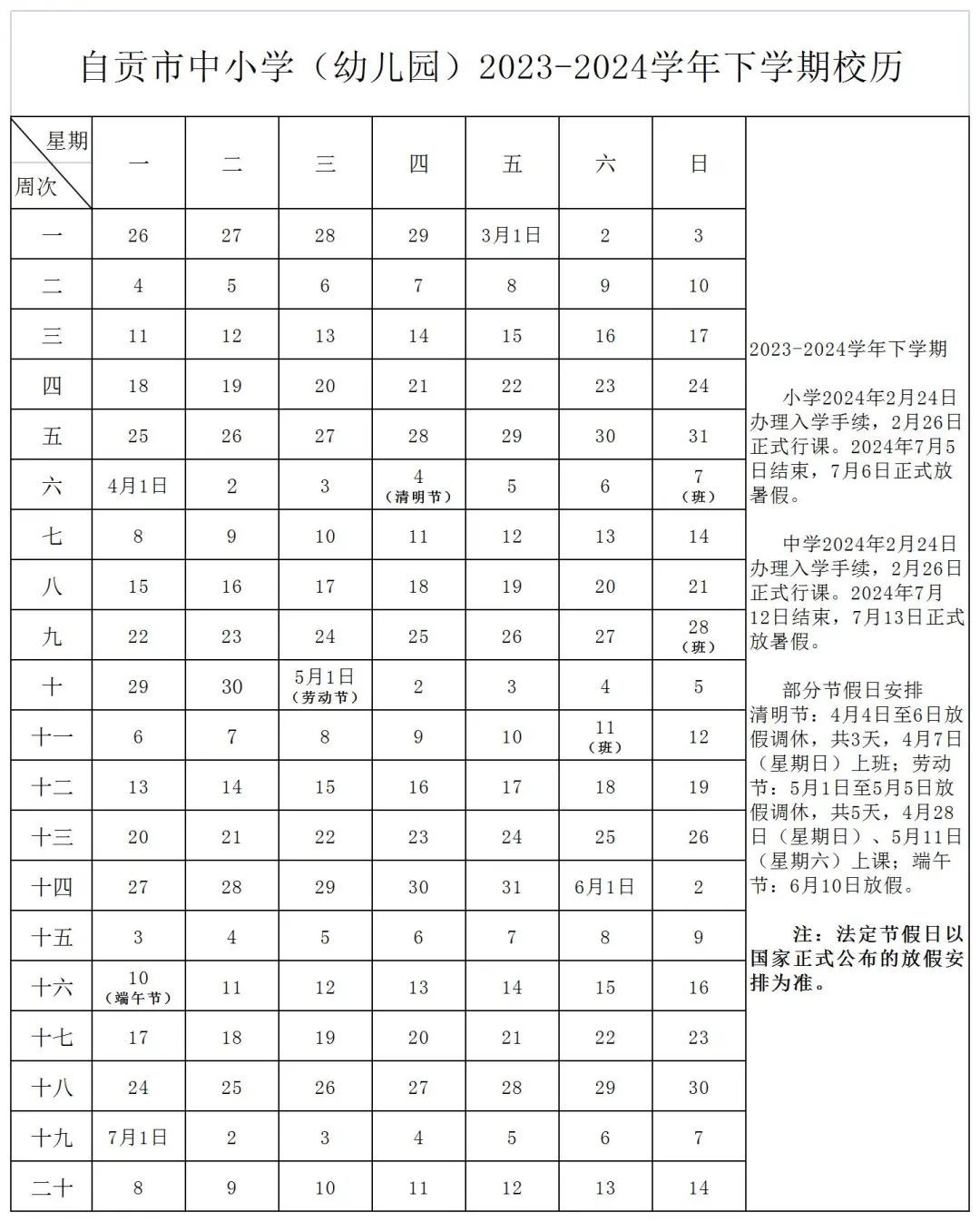 从自贡市教育和体育局获悉,小学(幼儿园)2月23日教师返校,2月25日学生报到注册,2月26日正式行课,到7月5日结束,共计十九周(含复习考试和学校机动时间)。暑假从7月6日开始到8月30日结束。