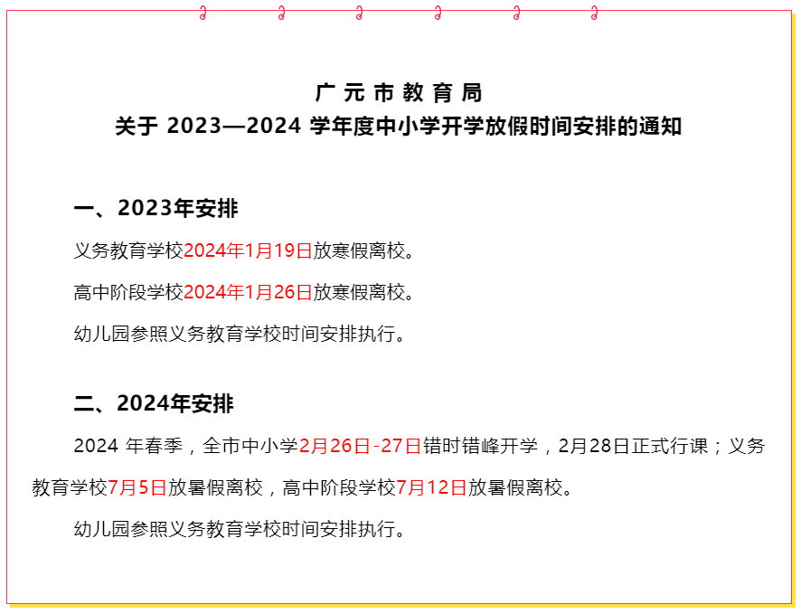 据广元市教育局通知,2024年春季,广元市中小学2月26日-27日错时错峰开学,2月28日正式行课;义务教育学校7月5日放暑假离校,高中阶段学校7月12日放暑假离校。