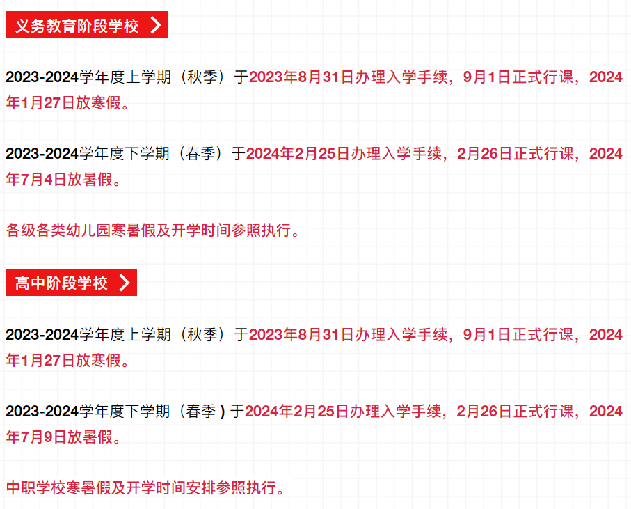 义务教育阶段,2月25日到校报名注册,2月26日正式行课,7月5日结束,7月6日开始放暑假。