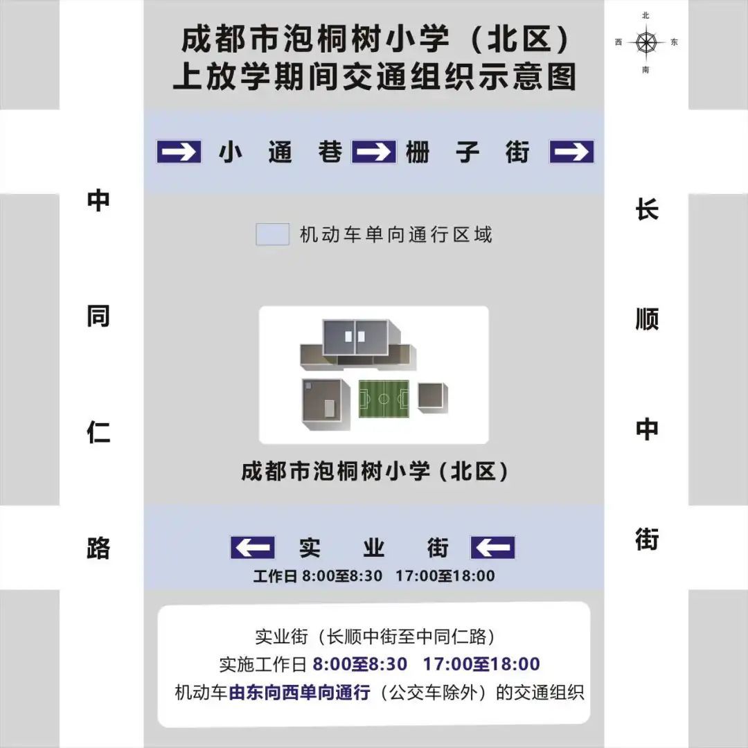 (一)成都市泡桐树小学(北区)周边的实业街(长顺中街至中同仁路)实施工作日8:00至8:30,17:00至18:00机动车由东向西单向通行(公交车除外)的交通组织。