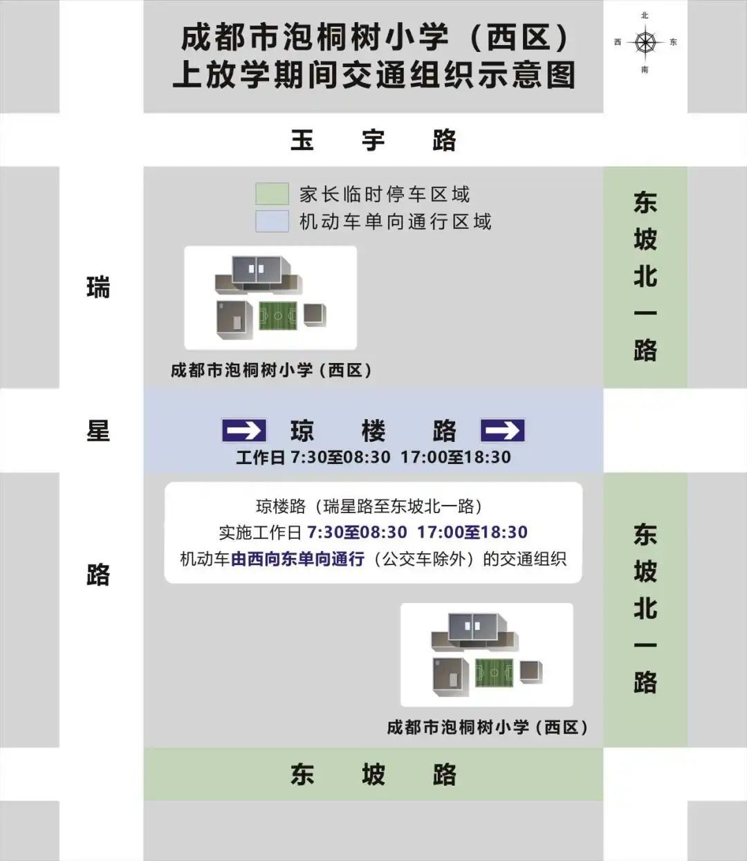 (二)成都市泡桐树小学(西区分校A、B校区)周边的琼楼路(瑞星路至东坡北一路)实施工作日7:30至08:30,17:00至18:30机动车由西向东单向通行(公交车除外)的交通组织。