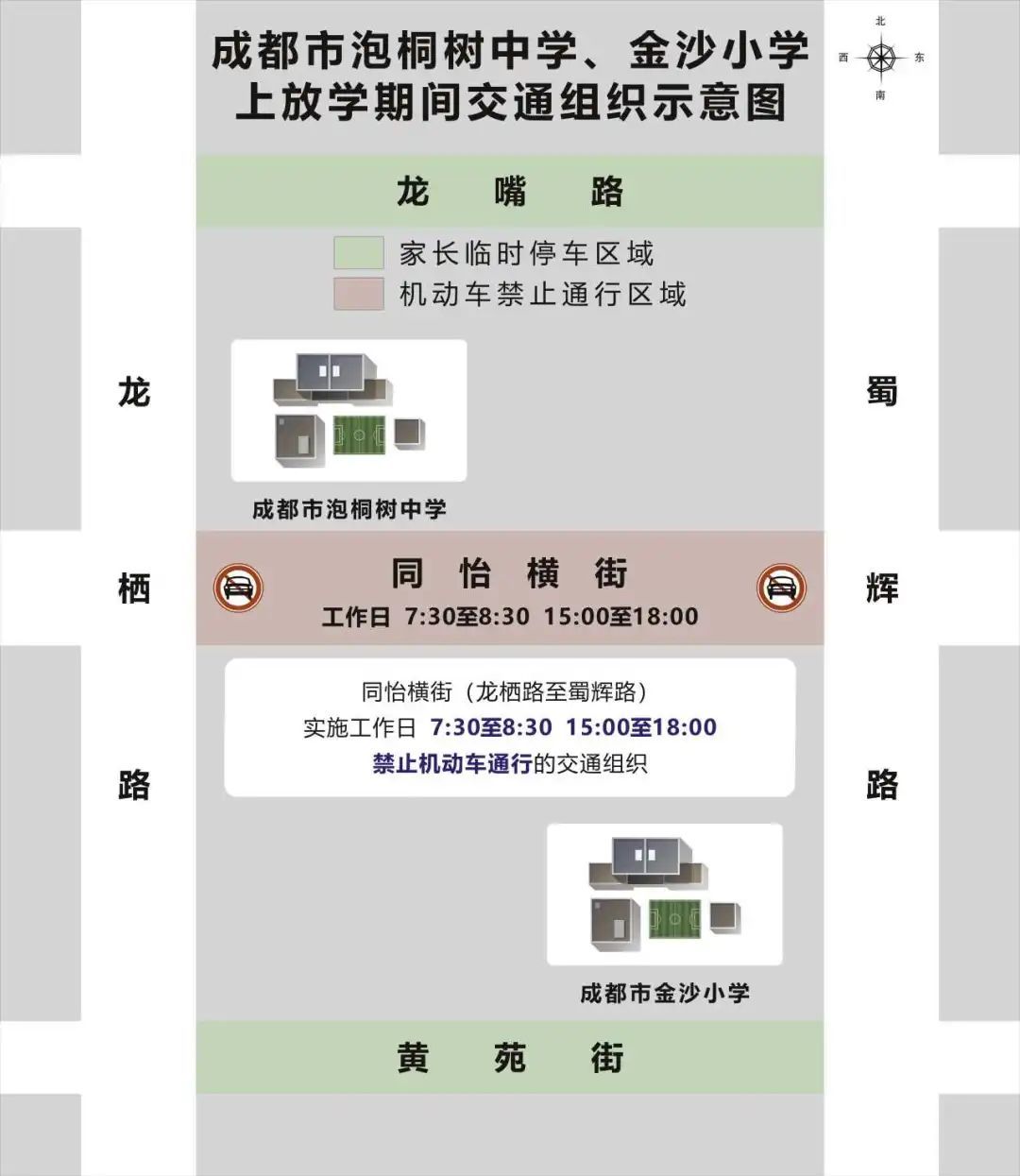 (三)成都市泡桐树中学、金沙小学周边的同怡横街(龙栖路至蜀辉路)实施工作日7:30至8:30,15:00至18:00禁止机动车通行的交通组织。