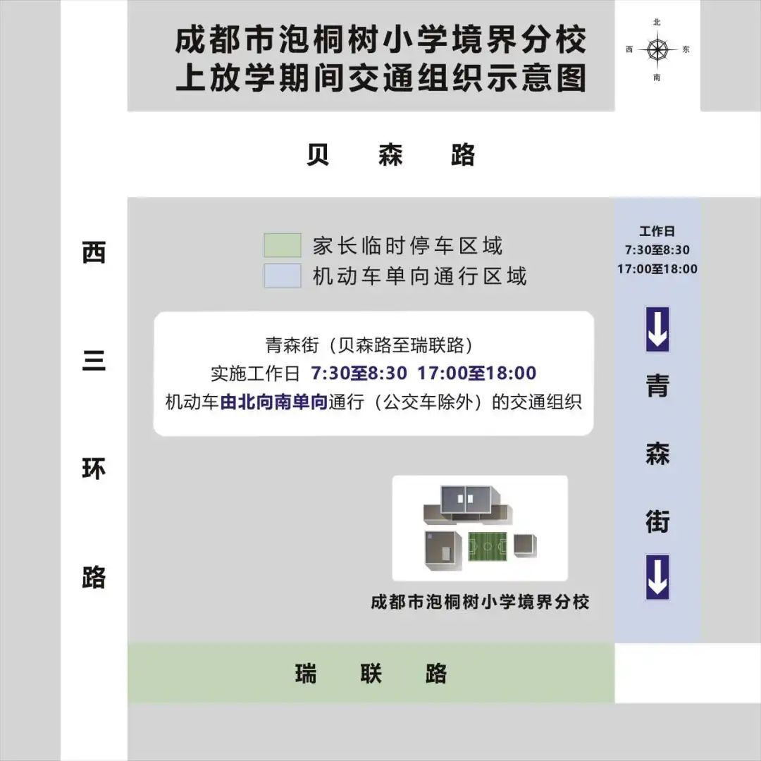 (四)成都市泡桐树小学周边的青森街(贝森路至瑞联路)实施工作日7:30至8:30,17:00至18:00机动车由北向南单向通行(公交车除外)的交通组织。