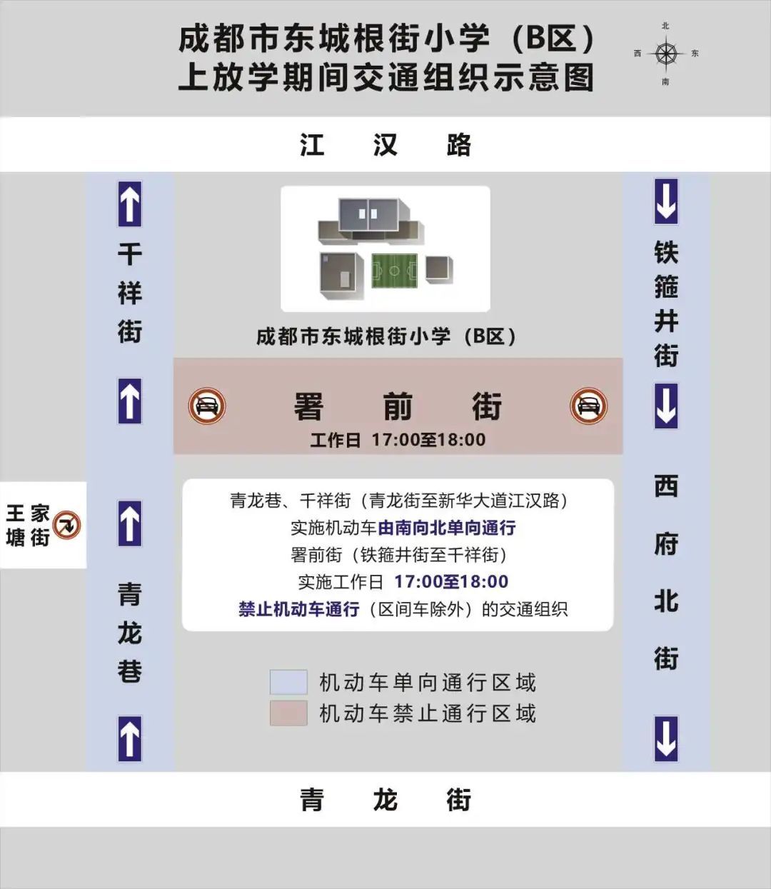 (五)成都市东城根街小学(B区)周边的青龙巷、千祥街(青龙街至新华大道江汉路)实施机动车由南向北单向通行,署前街(铁箍井街至千祥街)实施工作日17:00至18:00禁止机动车通行(区间车除外)的交通组织。