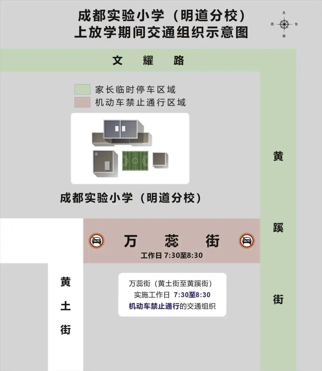 (六)成都市实验小学(明道分校)周边的万蕊街(黄土街至黄蹊街)实施工作日7:30至8:30机动车禁止通行的交通组织。