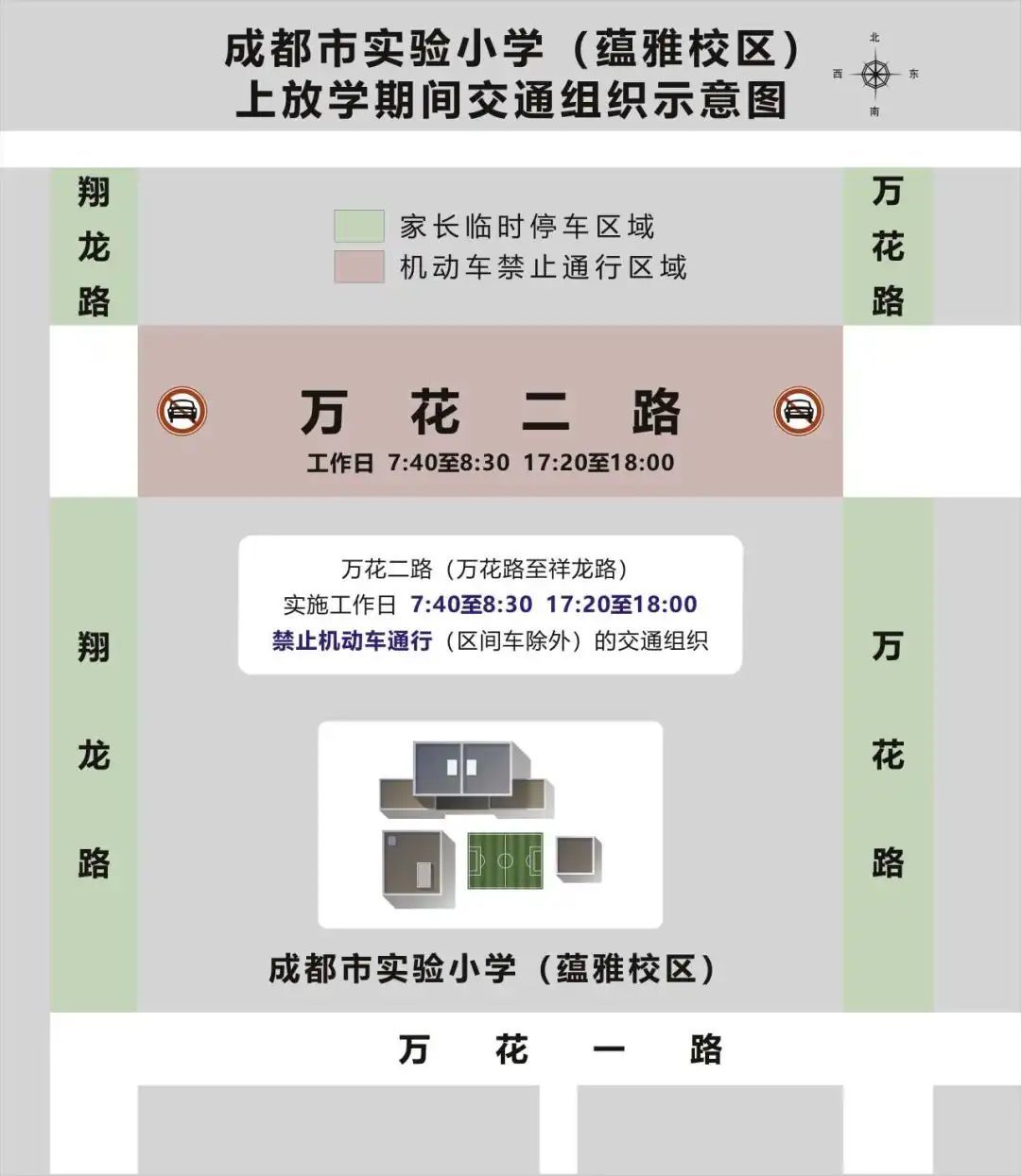 (七)成都市实验小学(蕴雅校区)周边的万花二路(万花路至祥龙路)实施工作日7:40至8:30,17:20至18:00禁止机动车通行(区间车除外)的交通组织。
