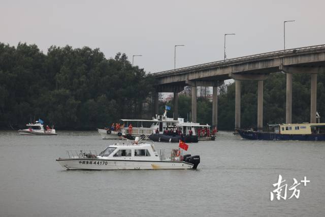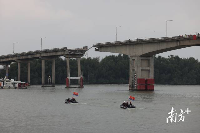 22日11时许,南方+记者在事故现场看到,大桥中间区域的桥墩都有防撞装置,桥体断裂位置在临近三民岛一侧的桥洞。现场可见超过10艘救援船只正在水道内作业;在岸边,不断有救援队伍抵达现场。