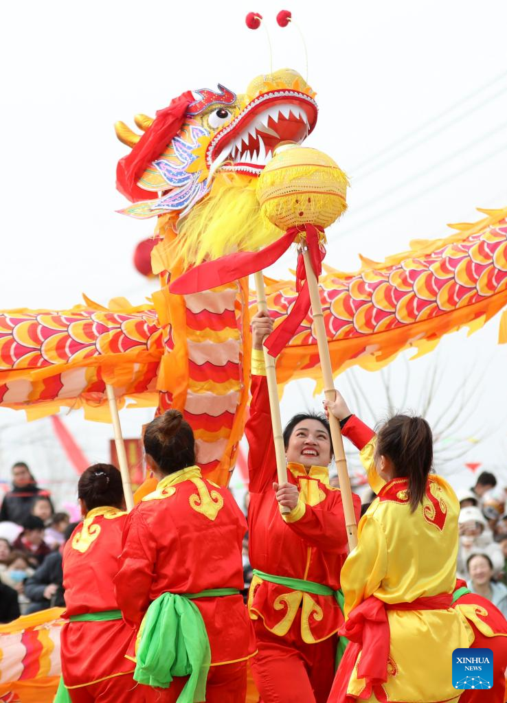 Actors give a dragon dance performance in celebration of the upcoming Lantern Festival in Jiacun Village in Jiuzhou Township of Cangxian County, north China's Hebei Province, Feb. 19, 2024. As the Lantern Festival is approaching, traditional dragon dance performances are staged across the country in full festive atmosphere. (Photo by Zhou Yang/Xinhua)