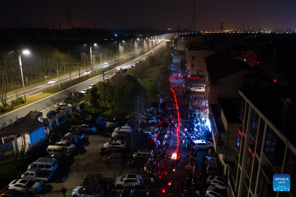 An aerial drone photo taken on Feb. 19, 2024 shows villagers performing lantern dragon dance in Xiazhai Village of Jinhua City, east China's Zhejiang Province. As the Lantern Festival approaches, villagers perform lantern dragon dance for good fortune and happiness. (Xinhua/Xu Yu)
