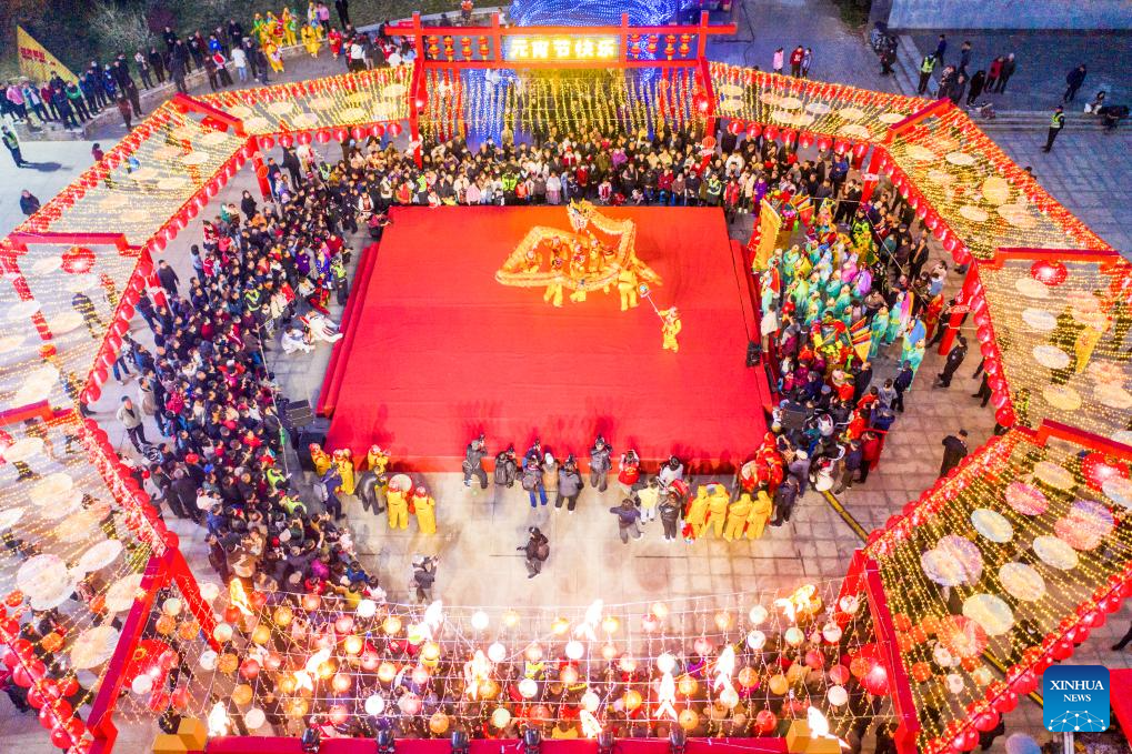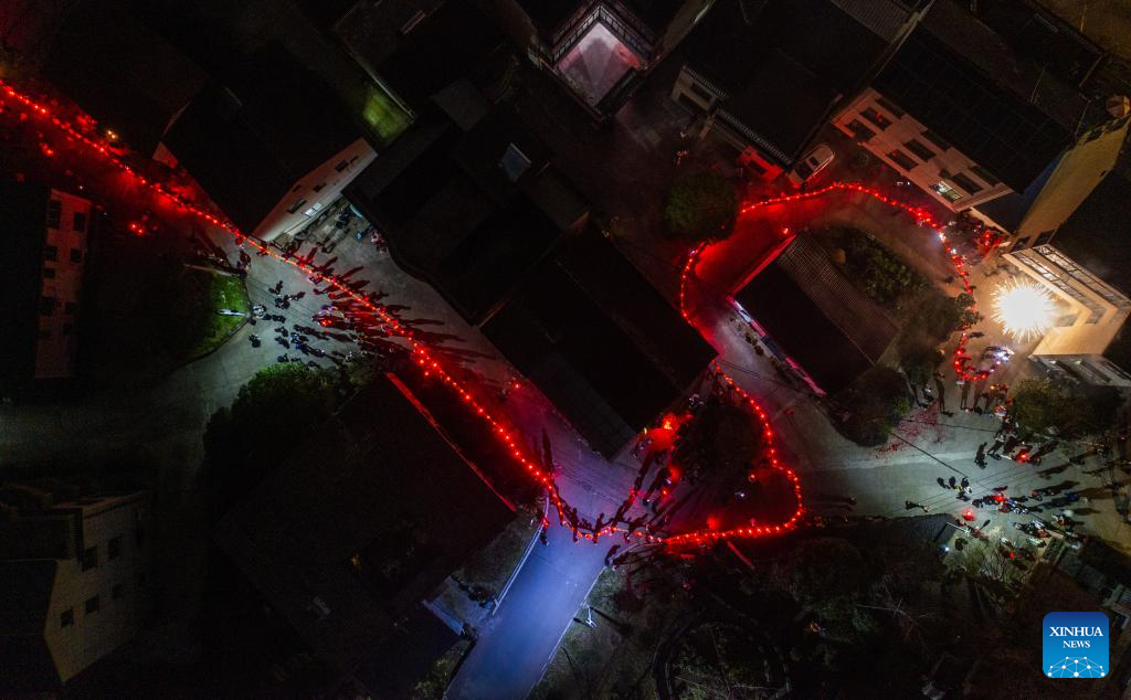 An aerial drone photo taken on Feb. 19, 2024 shows villagers performing lantern dragon dance in Lixin Village of Jinhua City, east China's Zhejiang Province. As the Lantern Festival approaches, villagers perform lantern dragon dance for good fortune and happiness. (Xinhua/Xu Yu)