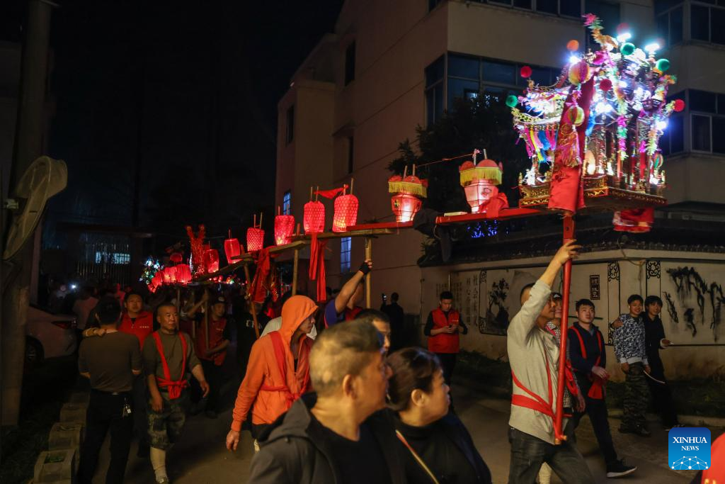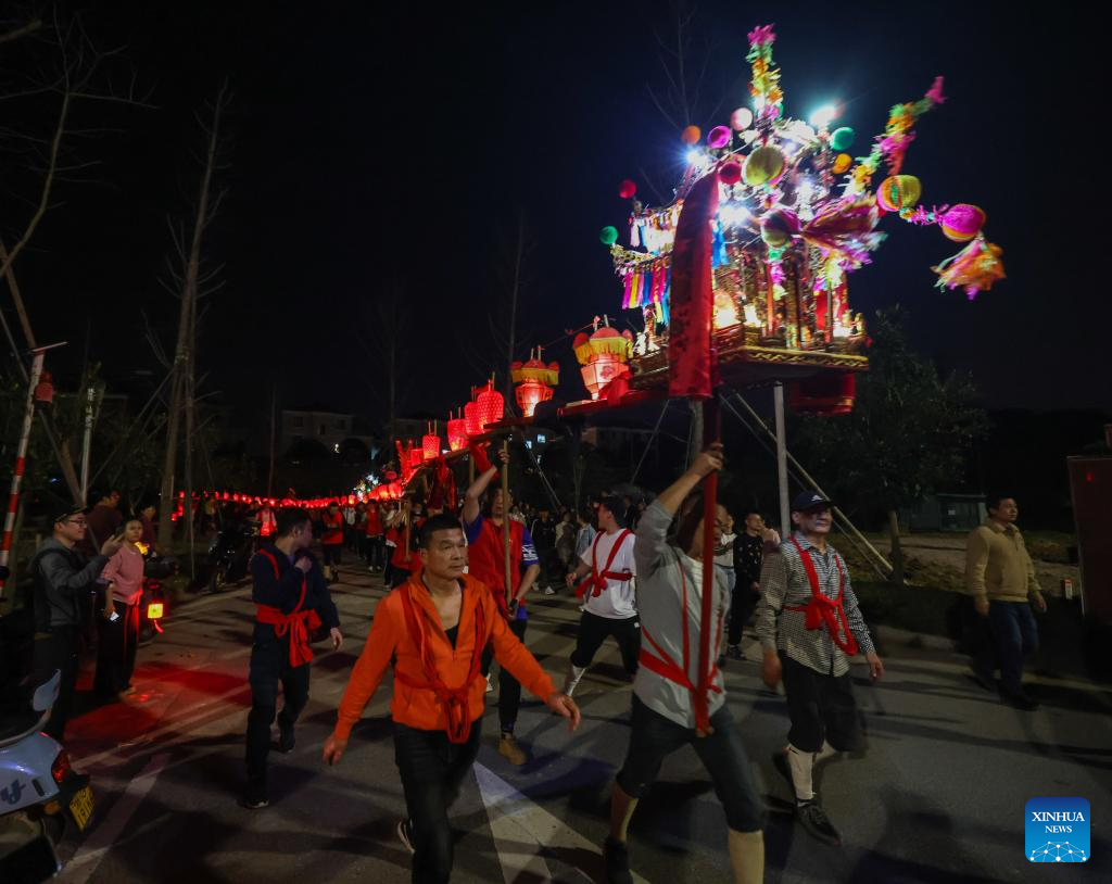 Villagers holding benches perform lantern dragon dance in Lixin Village of Jinhua City, east China's Zhejiang Province, Feb. 19, 2024. As the Lantern Festival approaches, villagers perform lantern dragon dance for good fortune and happiness. (Xinhua/Xu Yu)