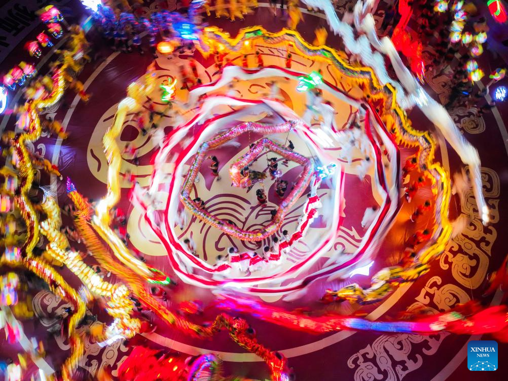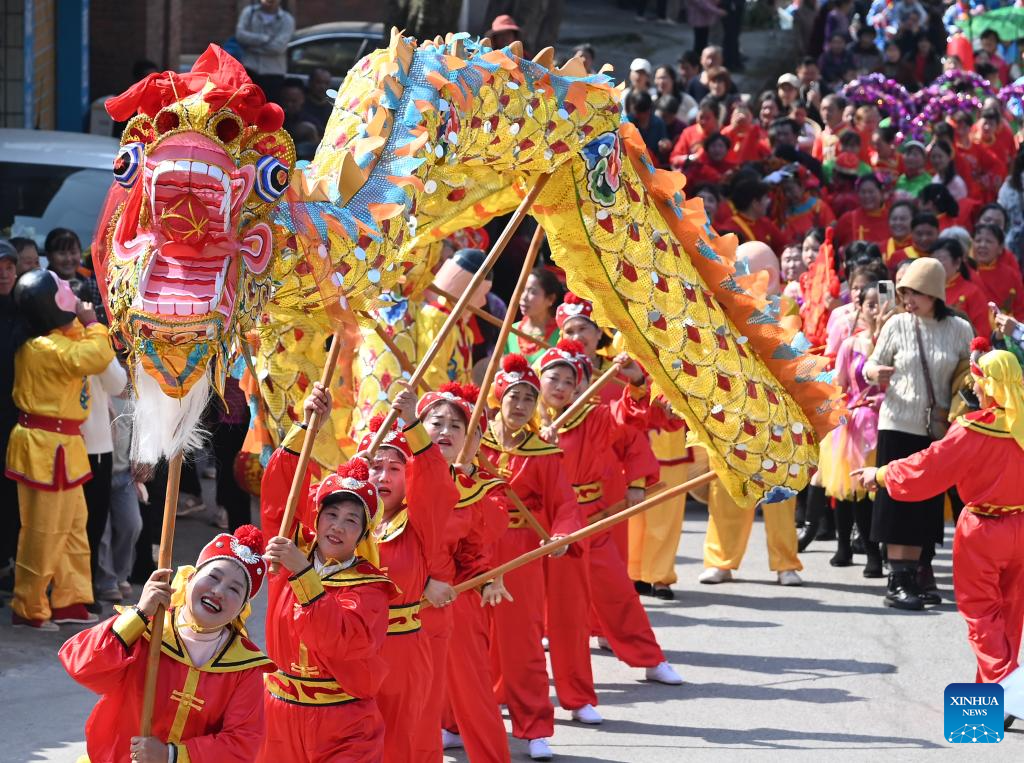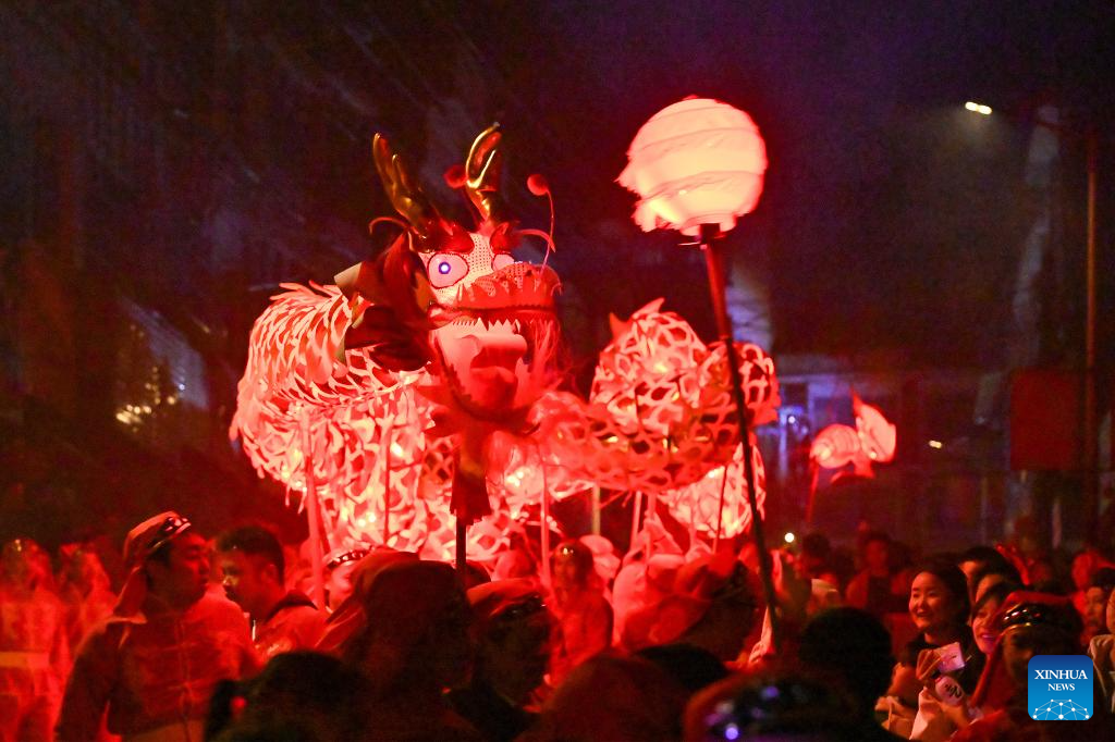 Actors give a dragon dance performance in celebration of the upcoming Lantern Festival in Beimu Township of Dongxing District in Neijiang City, southwest China's Sichuan Province, Feb. 18, 2024. As the Lantern Festival is approaching, traditional dragon dance performances are staged across the country in full festive atmosphere. (Photo by Tang Mingrun/Xinhua)