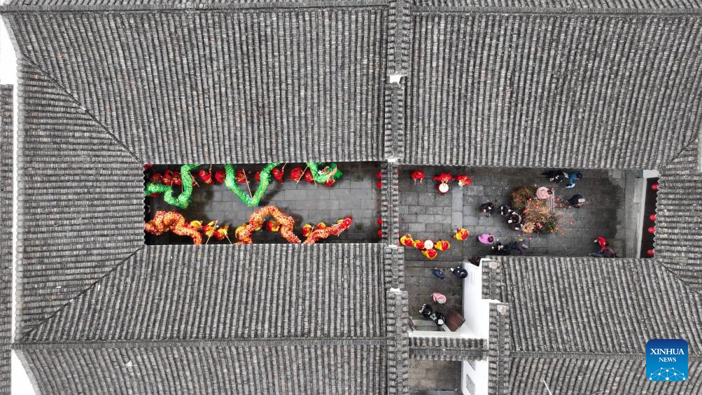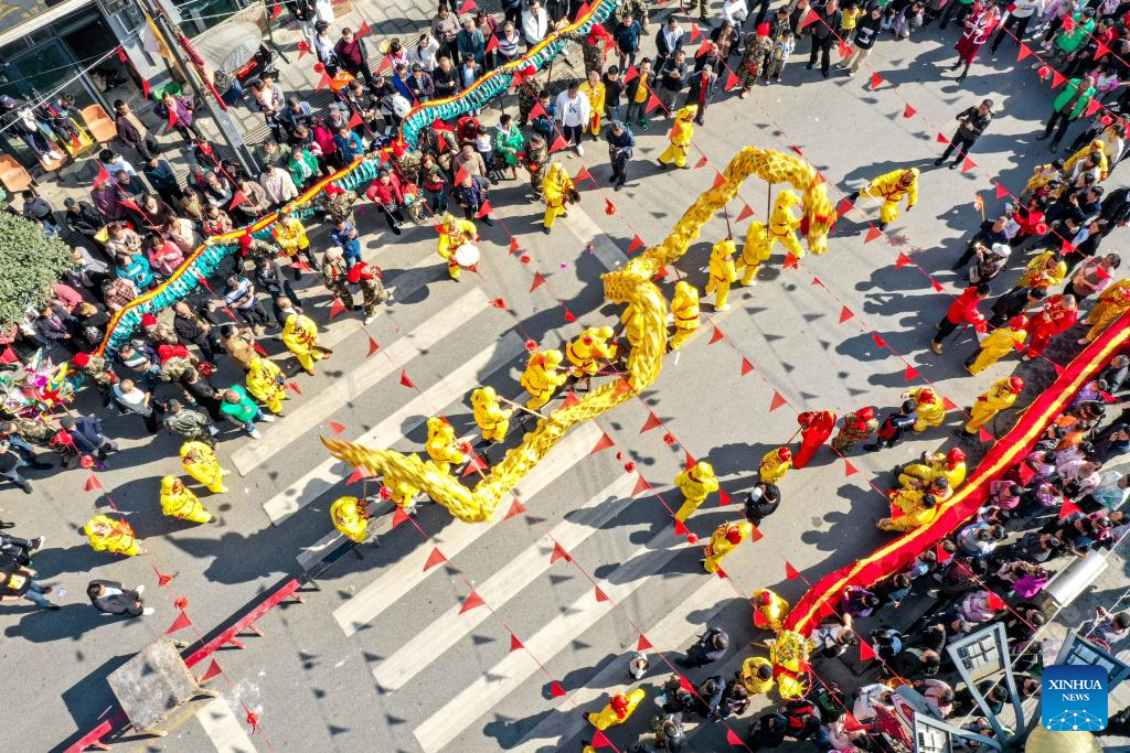 An aerial drone photo taken on Feb. 20, 2024 shows a dragon dance performance in celebration of the upcoming Lantern Festival in Qianyuan Township of Deqing County in Huzhou City, east China's Zhejiang Province. As the Lantern Festival is approaching, traditional dragon dance performances are staged across the country in full festive atmosphere. (Photo by Xie Shangguo/Xinhua)