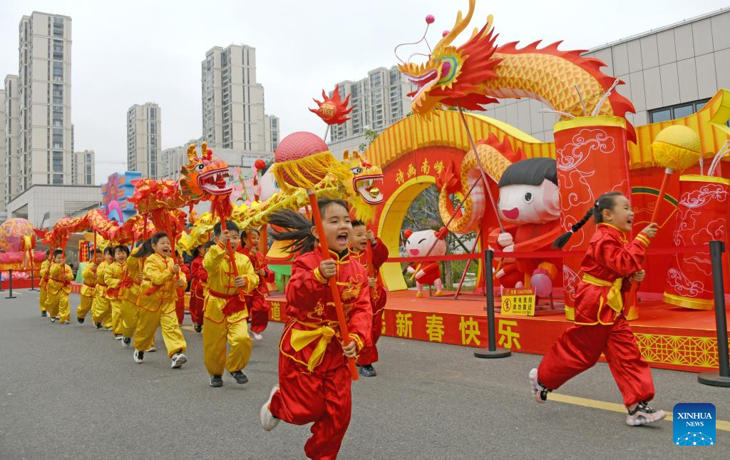 Children give a dragon dance performance in celebration of the upcoming Lantern Festival in Xianju County in Taizhou City, east China's Zhejiang Province, Feb. 20, 2024. As the Lantern Festival is approaching, traditional dragon dance performances are staged across the country in full festive atmosphere. (Photo by Wang Huabin/Xinhua)