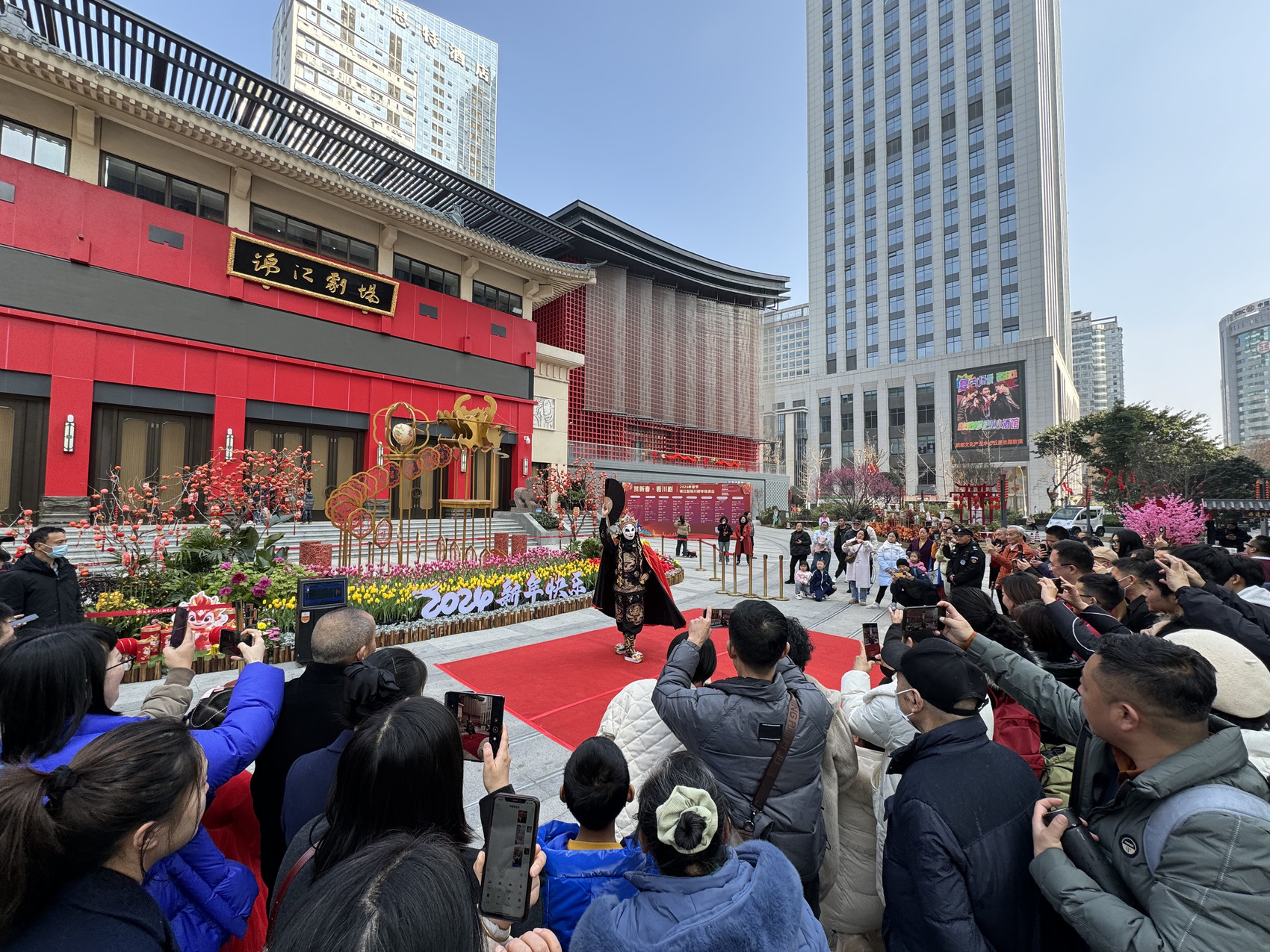 在锦江剧场和悦来茶园门外,各色花卉、彩灯和灯笼的装点格外喜庆。每天下午,成都市川剧研究院都在这里进行川剧器乐演奏和川剧技艺路演,并开设龙年悦来市集,带来非遗冰糖葫芦、非遗蜀绣、文创大熊猫、经典成都小吃等丰富内容。正月初一至初八,成都市川剧研究院共在此举办40场演出活动,接待观众近4800人次。