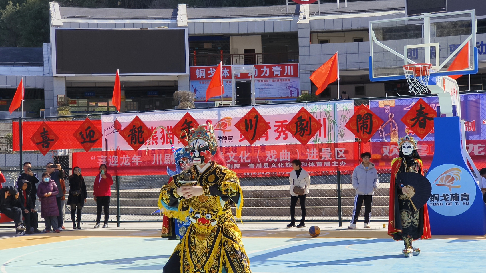 这个春节,川剧还在跨界创新中“出圈”。2月15日,广元市青川县战国木牍文化生态园景区,一场“戏曲+篮球”特别活动正在上演——在三人制“坝坝篮球”赛场上,四川省川剧院带来的变脸、吐火表演,现场掌声和喝彩声此起彼伏,为当地群众带来前所未有的视听盛宴。