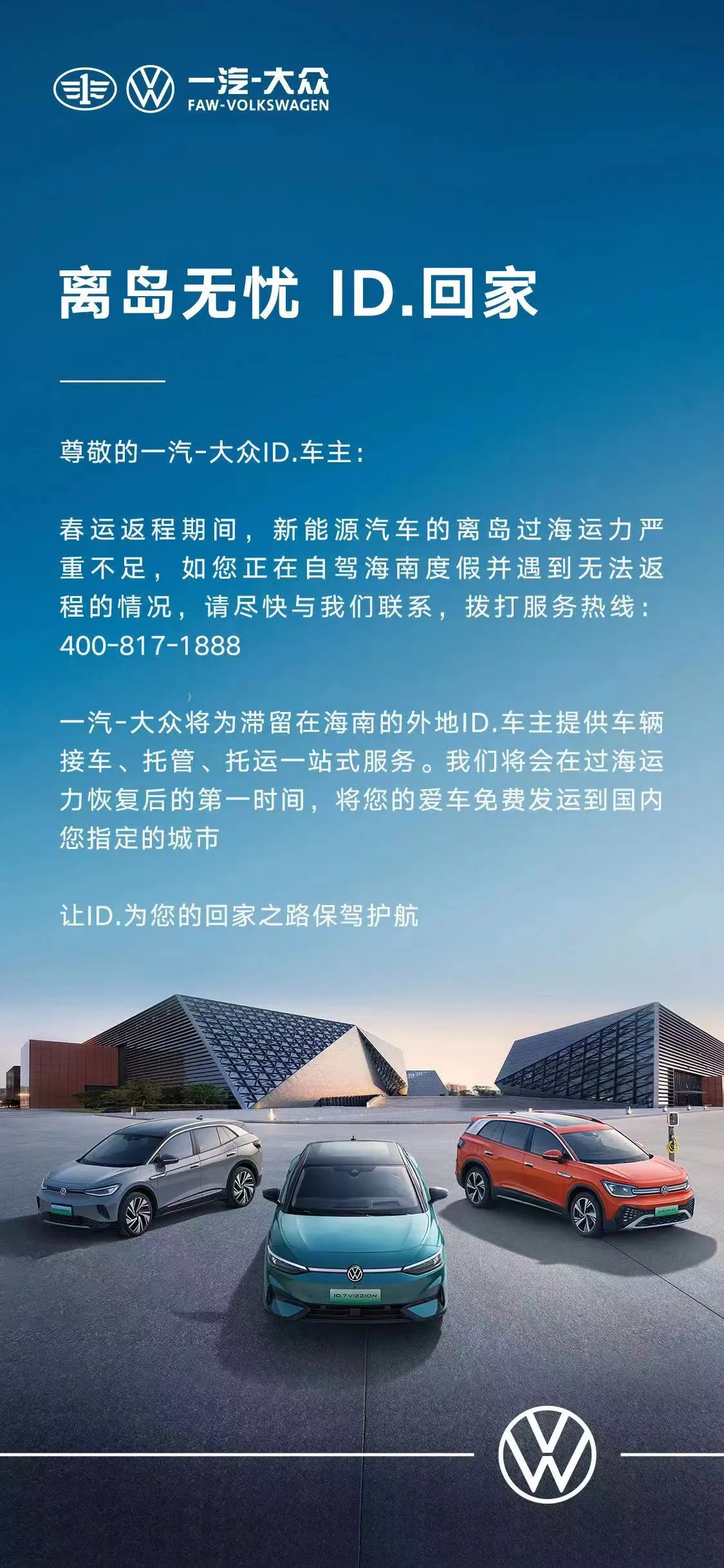 2月20日,一汽-大众针对旗下ID.车主发起“离岛无忧,ID.回家”行动。一汽-大众称,如ID.车主正自驾海南度假并遇到无法返程的情况,可以与一汽-大众进行联系,一汽-大众将为滞留在海南的外地ID.车主提供车辆接车、托管、托运一站式服务,在过海运力恢复后的第一时间,一汽-大众将车主的爱车免费发运到国内指定城市。