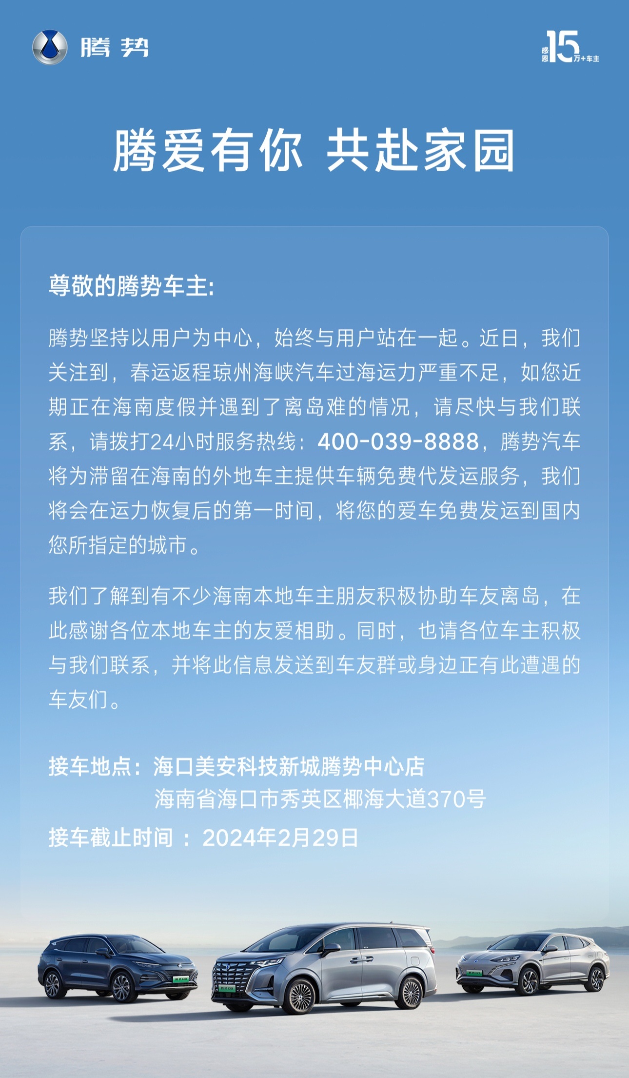 记者了解到,截至2月22日14时,腾势汽车已经确认在海南有130台车辆需要免费托运服务,已经有32台在门店等待托运。