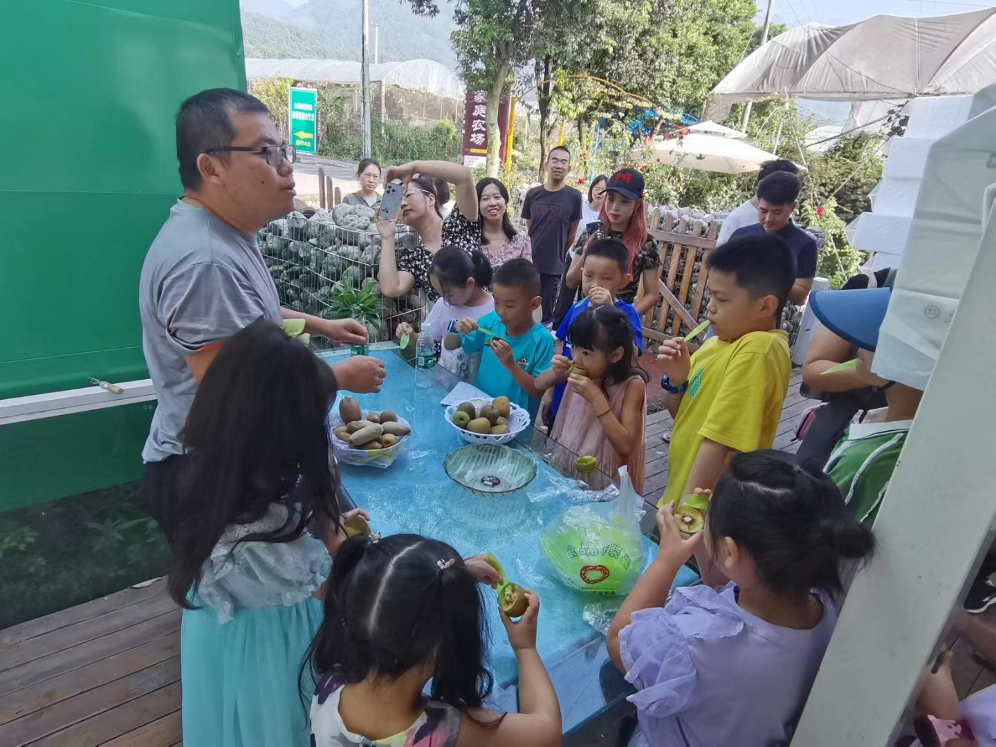 邓方贵正在向小朋友科普猕猴桃知识。