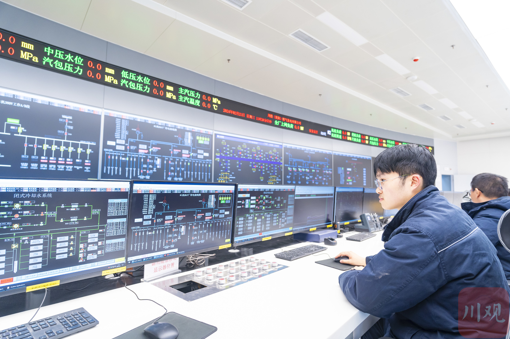 在主厂房的一侧,是智慧管控中心。在该中心核心区域,值长台、操作员站、工程师站依次分布,20多名工作人员各司其职,进行设备调试工作,8块屏幕组成的智慧管控系统上数字不断变化。