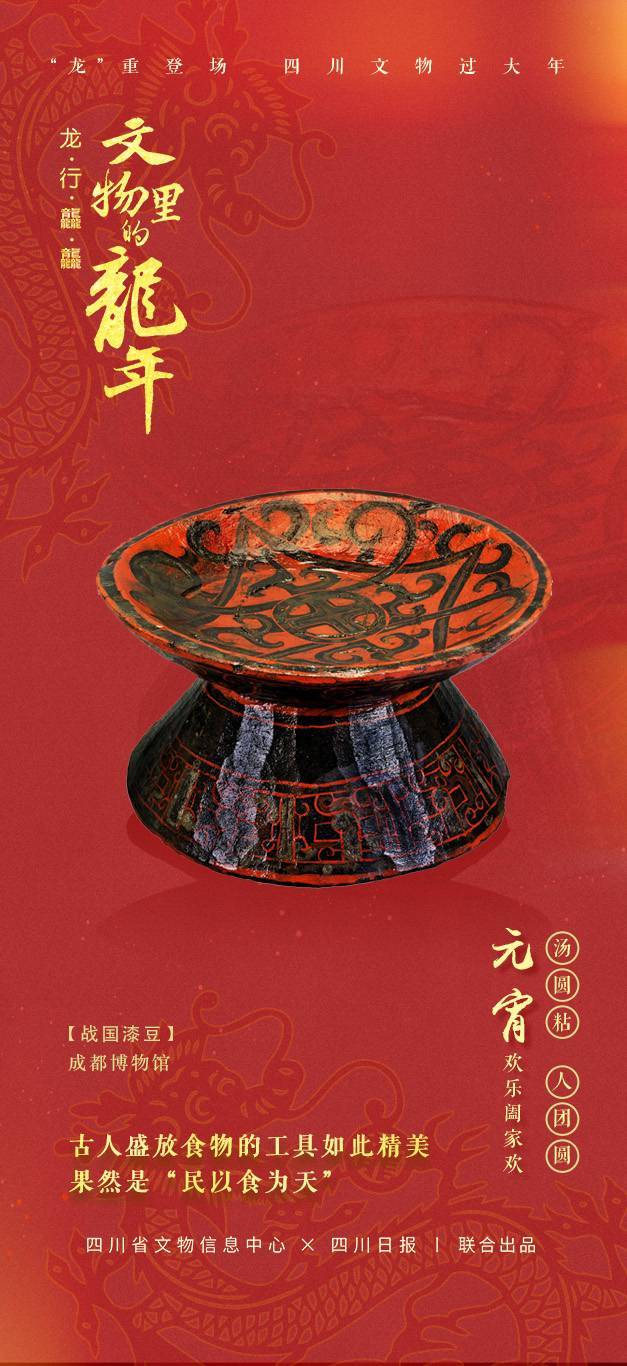 要说吃饭的仪式感,那古人绝对当仁不让。这件成都商业街船棺葬出土的战国漆豆,是一件盛放食物的生活用具。仅仅是一个“食器”,古人便在器物表面髹以黑漆,盘面大部分涂朱,用线面结合的方法绘制出复杂的纹样,盘外壁纹饰似蝉纹。圈足上则以朱、赭两色单线勾填蟠螭纹。如此精美的器皿盛上食物,是不是让人胃口大开?
