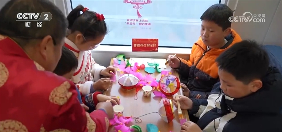 在G7581次列车的餐车车厢里,铁路部门工作人员邀请了来自南京的“秦淮灯彩”非遗传承人现场为大家讲解非遗制作技艺,并指导小朋友们做花灯。另一边,身穿汉服的工作人员正在组织旅客们猜灯谜,让大家在旅途中也能感受到浓浓的节日氛围。
