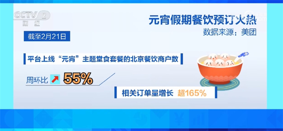 值得注意的是,线上的餐饮预订情况和线下消费同样火热。平台数据显示,截至2月21日,平台上线“元宵”主题堂食套餐的北京餐饮商户数周环比增长55%,相关订单量增长超165%。