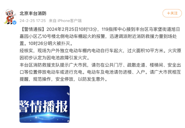 2024年2月25日10时13分,119指挥中心接到丰台区马家堡街道旭日嘉园小区乙10号楼北侧电动车棚起火的报警,迅速调派附近消防救援力量到场处置。10时26分明火被扑灭。