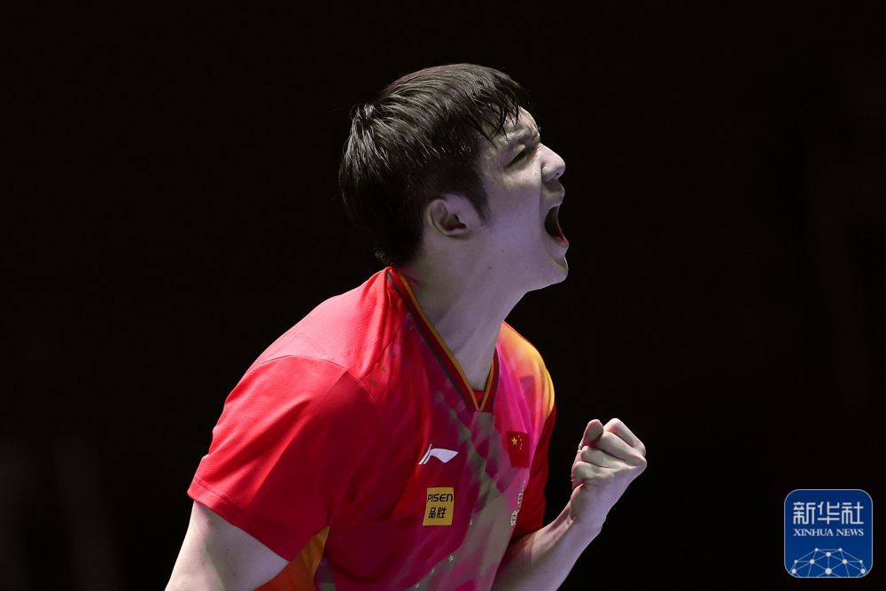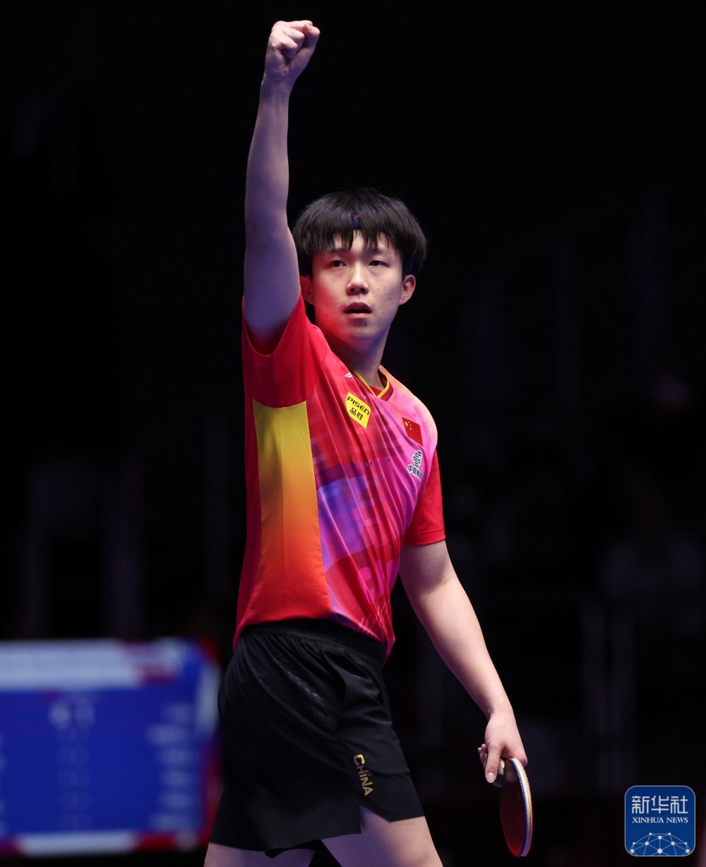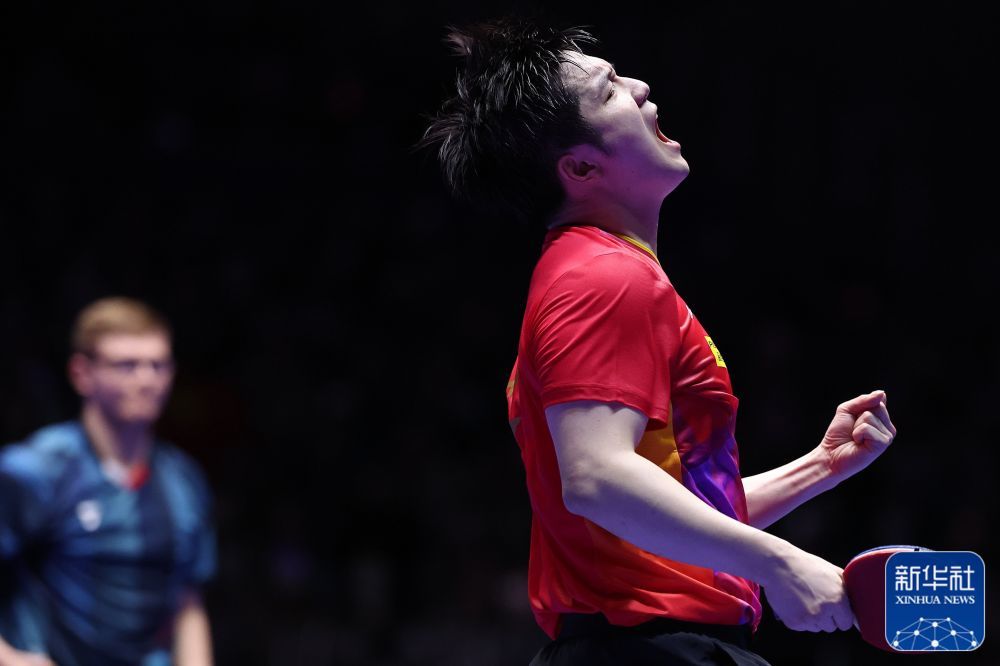 中国队选手王楚钦在第一盘比赛中庆祝得分。最终,他3比0战胜法国队选手费利克斯·勒布伦。新华社记者 张涛 摄
