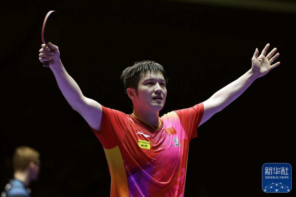中国队选手樊振东在第二盘比赛中庆祝获胜,他3比2战胜法国队选手艾利克斯·勒布伦。新华社记者 杨世尧 摄