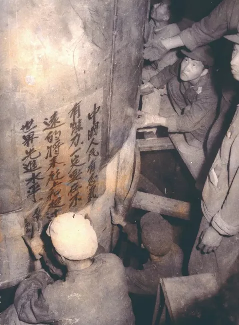 几十年前,第一代核潜艇陆上模式堆的压力容器在四川正式安装就位。容器外面贴着一幅字:“中国人民有志气、有能力,一定要在不远的将来,赶上和超过世界先进水平。”(中核集团 供图)